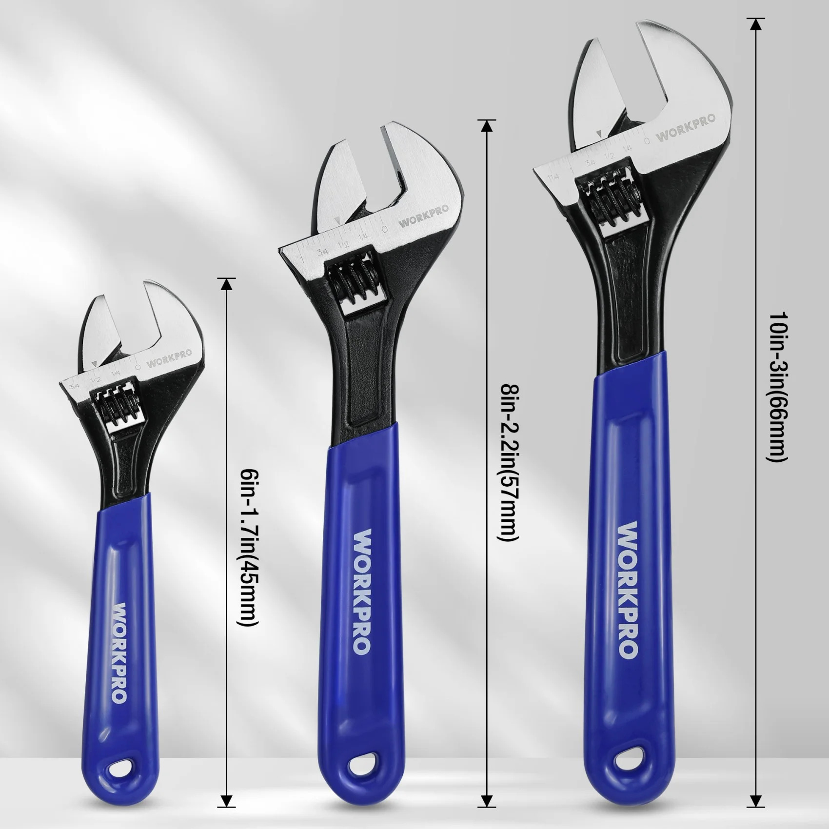 WORKPRO 3-Piece Adjustable Wrench Set, 6in, 8in & 10in Wrenches with Ergonomic Grip for Home, Garage, Workshop
